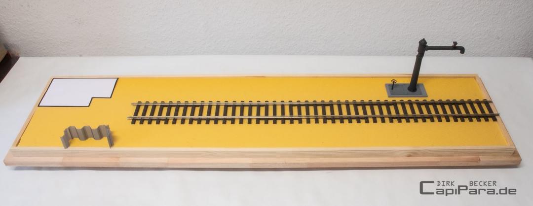 Die Basis für dieses Diorama bildet wieder eine Leimholzplatte in den Abmessungen von 120 x 0,30 cm. Darauf kommt die gestaltete Dioramafläche von 116 x 0,27 cm. Auf dem umlaufenden Rand stützt sich die Acrylglashaube auf.