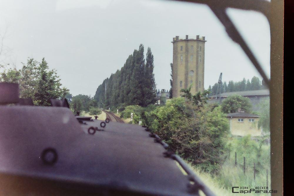 Sommer 1986, ich bin zur Mittagszeit mit P 4425 auf dem Weg von Aschersleben nach Belzig. Vor wenigen Minuten bin ich in Calbe/S. West abgefahren (KBS 682) und passiere nun zur Rechten das Gelände vom VEB Förderanlagenbau Calbe (ehem. Bw Calbe West). Deutlich ist der große gemauerte Wasserturm zu sehen. Hinter der Pappelreihe befinden sich die Sozialgebäude. Das Lichtvorsignal gehört zum Bocksignal der Abzweigstelle Tornitz und zeigt "Fahrt frei erwarten".