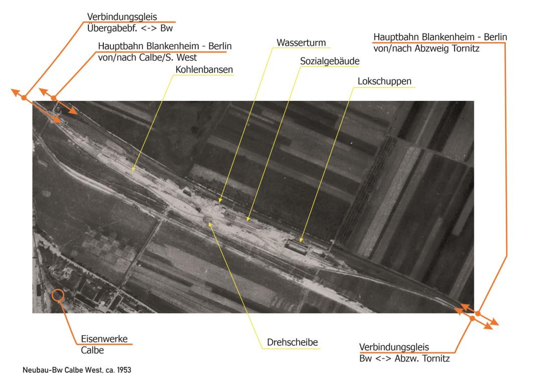 Da sich das nächste Bahnbetriebswerk in Güsten (17,6 Strecken-km = KBS 682), Bernburg (17,3 Strecken-km = KBS 671) und Köthen (22,7 Stecken-km = KBS 730) befand, hielt man für den Verkehr zum und vom Eisenwerk ein neues Bahnbetriebswerk für nötig = das Neubau-Bw Calbe West.