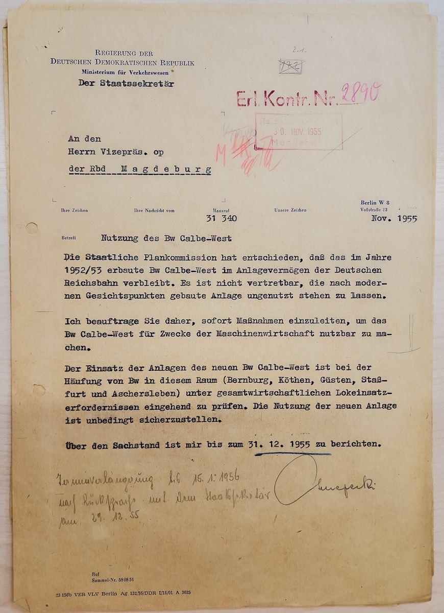In einem Schreiben vom 25.09.1956 teile der Präsident der Rbd Magdeburg dem Verkehrsminister der DDR mit, das die "Verfügung des Staatssekretärs zur Inbetriebnahme des Bw Calbe/West" vom November 1955 in drei Stufen erfolgen solle. In der ersten Etappe sollten 5 Loks der BR 50 sowie 5 Rangierloks in Calbe beheimatet werden. In der zweiten Etappe sollten alle Leistungen vom Bw Bernburg nach Calbe verlagert werden und Bernburg sollte nur noch als Lokbf. für zwei Rangierlokomotiven dienen. Auch die gesamte Werkstattausrüstung sollte von Bernburg nach Calbe umgesetzt werden. In der dritten Etappe sollte der Lokbestand durch vier weitere BR 44 auf insgesamt 17 Lokomotiven anwachsen (6 x BR 50, 4 x BR 44, 5 Rangierloks, 1 Reservelok, 1 Auswaschlok).