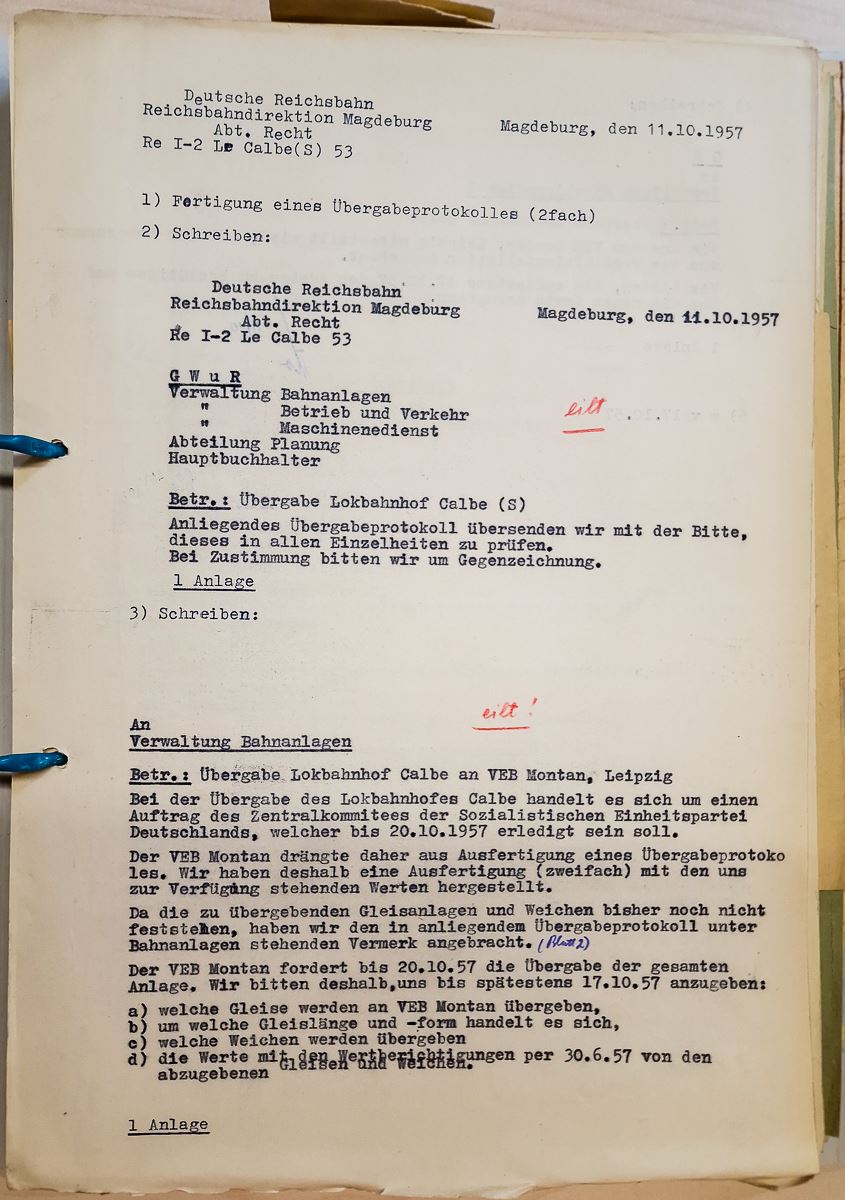 Nun sollte Alles ganz schnell gehen. Die Beräumung des Lokschuppens sollte seitens der DR bis zum 15.06.1957 erfolgen. Die Auswaschanlage wurde zum Bw Oebisfelde umgesetzt und die 23m-Drehscheibe soll nach Eilsleben wechseln. Die bisher in Calbe vorgenommenen Arbeiten an den Dampfloks wurde kurzfristig eingestellt und wieder im Bw Güsten und Bw Bernburg vorgenommen. Die Überschreibung vom DR-Eigentum (Land & Anlagen) hin zu den neuen Eigentümern EWW und MONTAN zog sich in den Büchern bis 1959 hin. Der Wunsch der EWW, die ausgebaute 23m-Drehscheibe durch eine andere mit mindestens 16m Bühnenlänge zu ersetzen, fand bei der DR kein Gehör. Der Spurplan vom Bw wurde nach der Übernahme durch die neuen Eigentümer verändert und den neuen Bedürfnissen angepasst.