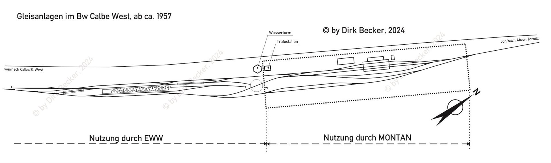 Und schon im Frühjahr 1957 suchte der VEB MONTAN den Kontakt zur DR, um Teile des Bw für ihre Zwecke nutzen zu dürfen. Die Verantwortlichen der Rbd Magdeburg war wohl zu diesem Zeitpunkt schon klar, das ihre Erwartungen an das neue Bw Calbe/West in Punkto Auslastung/Neuorientierung nicht zu halten sind. Im Frühling/ Sommer 1957 wurden die ersten Vertragsentwürfe zur Abgabe von Teilen des Bw sowohl an den VEB MONTAN als auch an den VEB Eisenwerke West geschrieben.